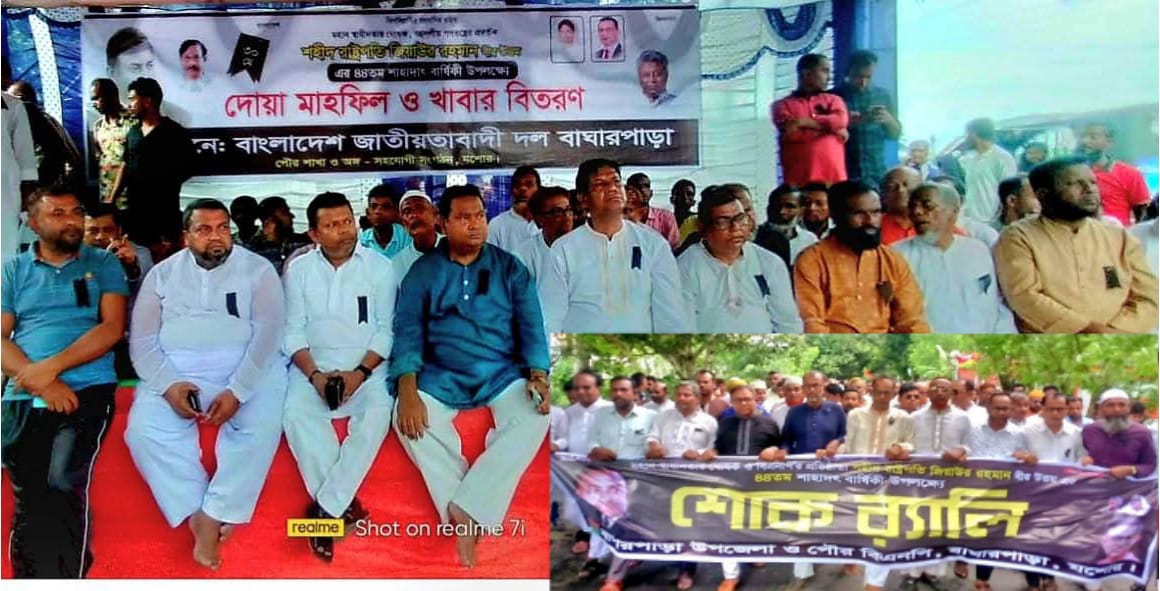 অপর দিকে জিয়াউর রহমানের শাহাদাত বার্ষিকী উপলক্ষে এদিন বিকেলে উপজেলার চৌরাস্তা মোড়ে পৌর বিএনপি কর্মসূচি পালন করেন। বাঘারপাড়া পৌর বিএনপির সভাপতি সাবেক মেয়র আব্দুল হাই মনা’র সভাপতিত্বে বক্তব্য রাখেন,বাঘারপাড়া উপজেলা বিএনপির সাবেক সাধারণ সম্পাদক আবু তাহের সিদ্দিকী, সাবেক উপজেলা চেয়ারম্যান মসিয়ুর রহমান, বাঘারপাড়া উপজেলা বিএনপির সাংগঠনিক সম্পাদক বিল্লাল হোসেন, বিএনপি নেতা হাদিউজ্জামান মিরান, মাসুদ আলম টিপু, নাজমুল লস্কর, মাষ্টার আবুল হোসেন, আব্দুল ওহাব, তবিবর রহমান, সাবেক ছাত্র নেতা হায়দার আলী, মনিরুজ্জামান, যুবনেতা নাফিস খান লিটন, ছাত্র নেতা হৃদয় তারেক প্রমুখ।# ০১৯৩২-০৮৯২৮৪ ।